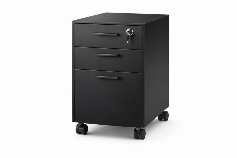 File Cabinet in Acciaio con Ruote e Serratura, 3 Cassetti, Nero