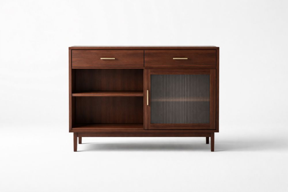 Credenza in legno con cassetti e porta a battente vetro temperato marrone 120x40x85 cm(Lu x L x H)