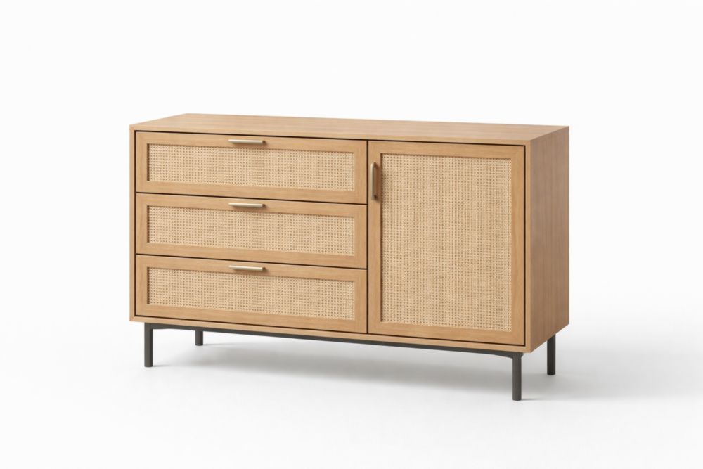 Credenza in Legno di Quercia e Rattan con 3 Cassetti e 1 Anta, Colore Naturale, 120x45x75 cm(Lu x L x H)