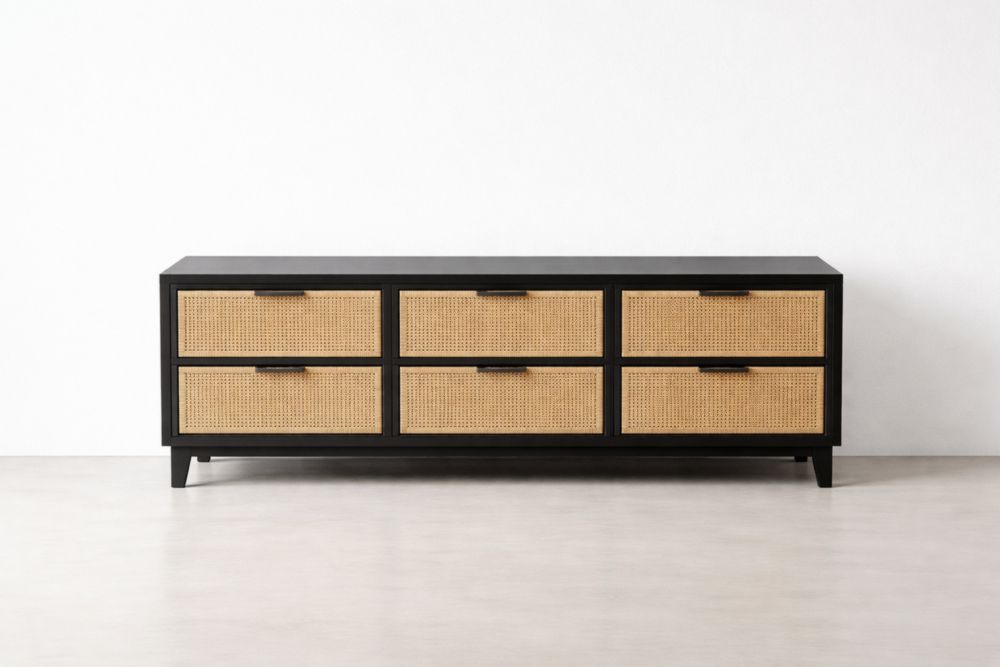 Materiali: Struttura in legno MDF, frontali dei cassetti in rattan.