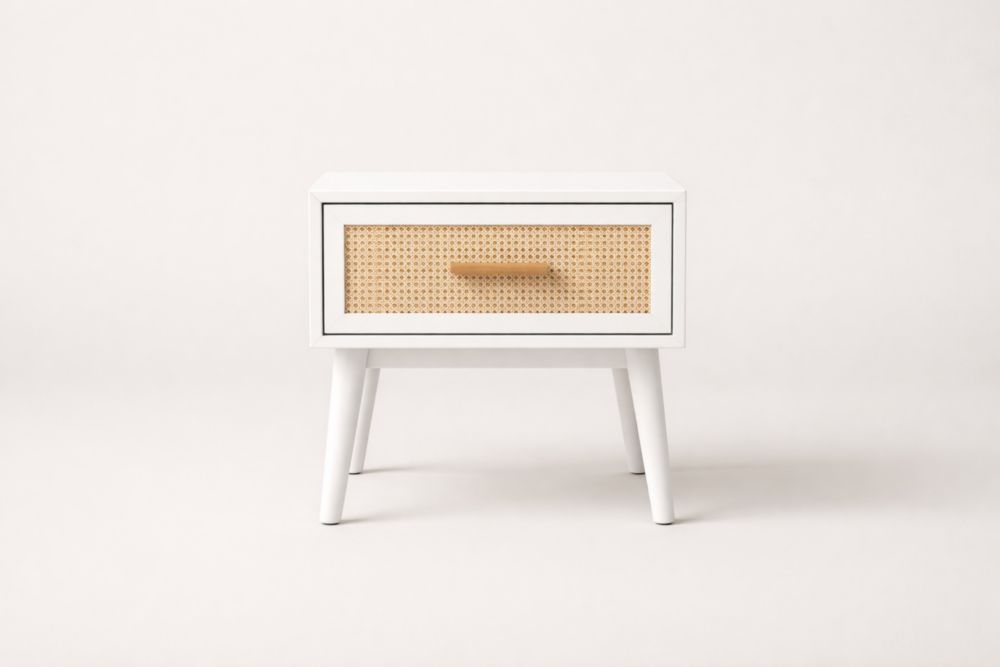 Materiale: Struttura in legno massello con frontale del cassetto in rattan.