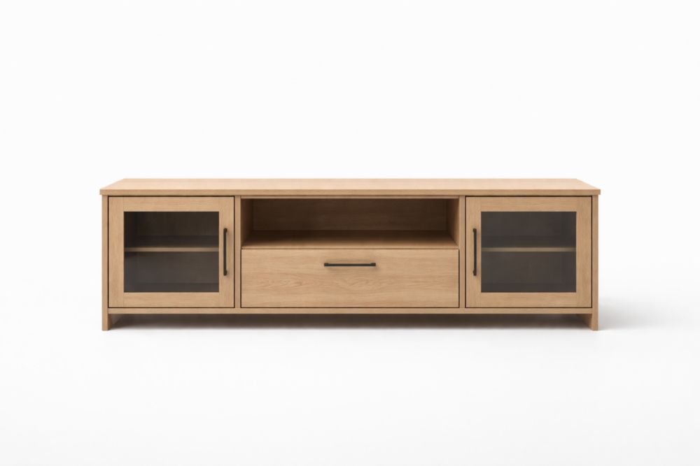 Mobile TV in legno massello, dotato di 2 ante in vetro temperato e un cassetto centrale.