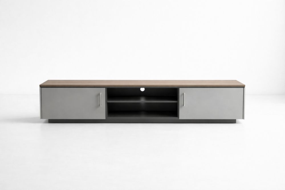l mobile TV è realizzato con pannelli di truciolato e acciaio. Dispone di due ante laterali e uno ripiani centrali, per riporre dispositivi elettronici. Il foro per la gestione dei cavi consente un'organizzazione ordinata. Misura 180 cm di lunghezza, 40 cm di profondità e 45 cm di altezza. Pulire con un panno umido evitando solventi e umidità eccessiva.