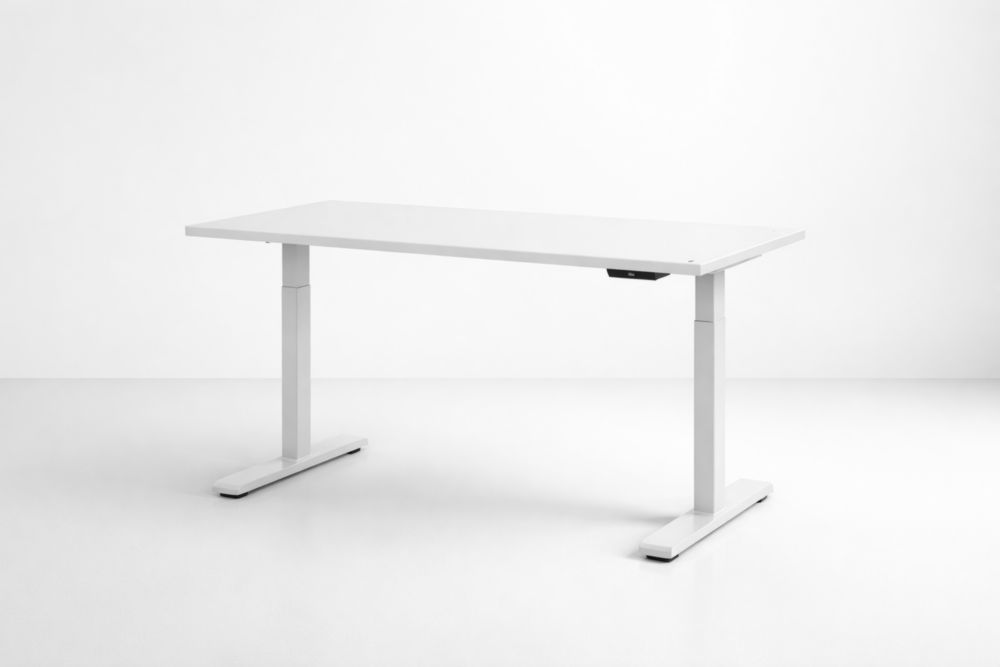 Superficie del tavolo realizzata in melaminico resistente, con gambe in acciaio verniciato bianco. La scrivania offre un meccanismo di regolazione elettrico per un'altezza variabile da 70 cm a 120 cm. Capacità di carico massimo: 70 kg.