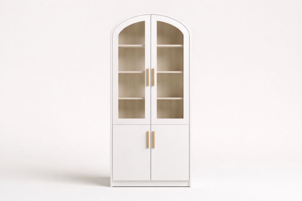 Questa vetrine presenta una struttura in MDF con finitura laccata bianca. Le porte sono dotate di vetro temperato e maniglie in legno massello.