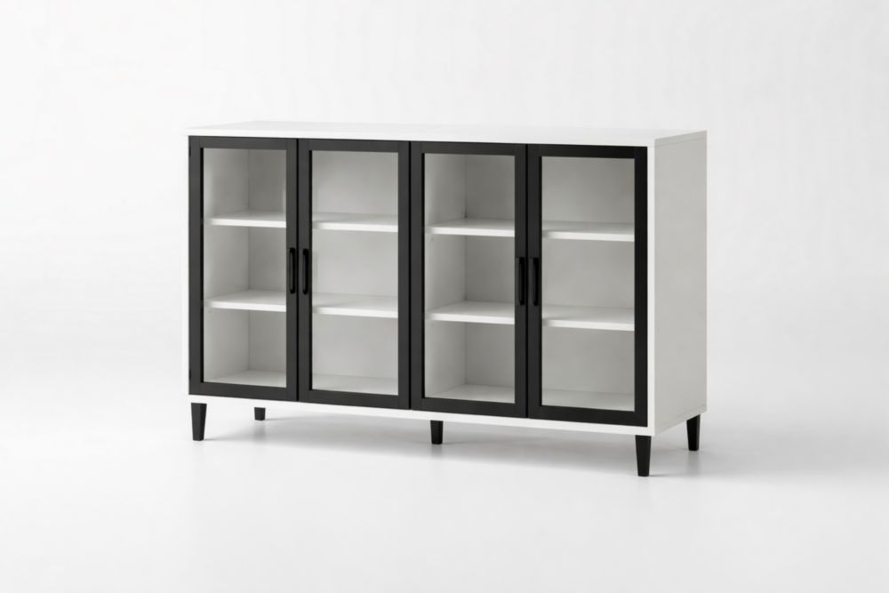 La vetrine è realizzata con struttura principale in MDF e ante in vetro temperato. Le gambe sono in acciaio. Il mobile misura 120 cm di lunghezza, 40 cm di larghezza e 90 cm di altezza. Dispone di ripiani interni regolabili e ante in vetro trasparente.